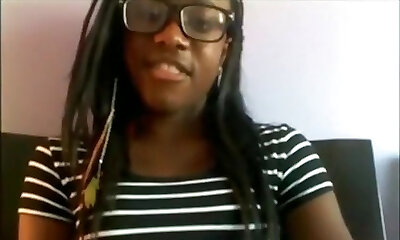 Black nerd with glasses masturbates with a hairbrush on her bed on skype