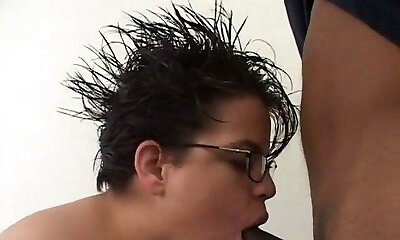 Chubby short haired schoolgirl with glasses gets black cock
