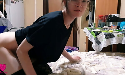 Amateur Latina with glasses moans while fingering her shaved slit