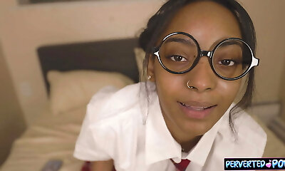 Sexy black nymph in glasses gives head and gets drilled by a white guy