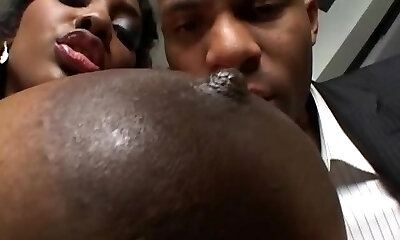 Ebony chick with big oiled up bra-stuffers gets fucked by White dude